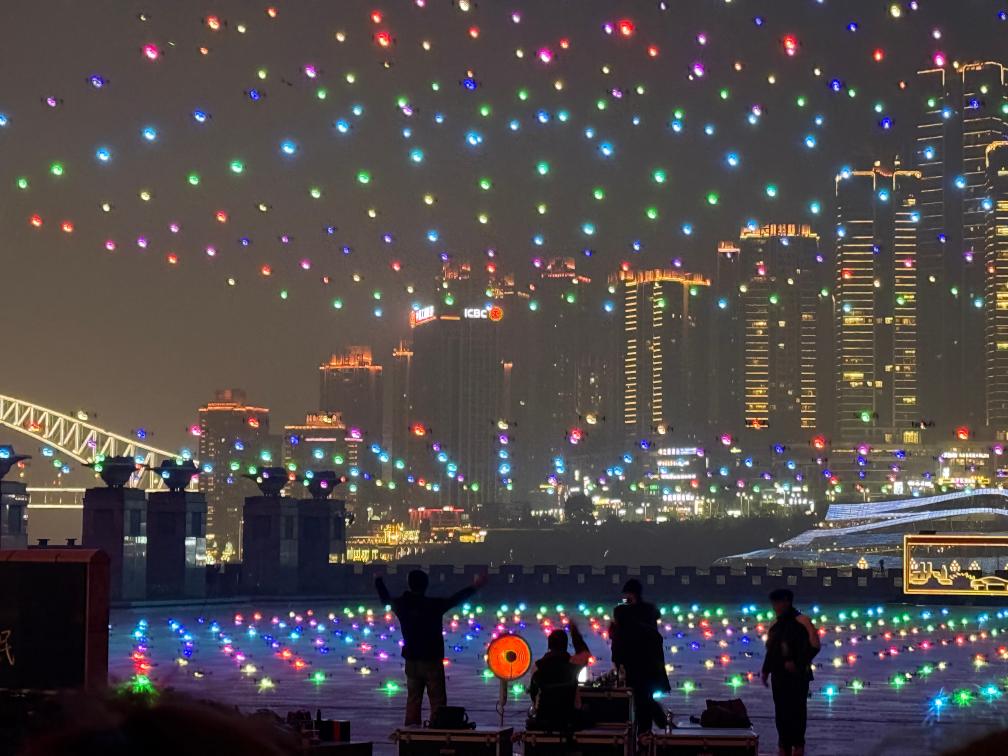 晚11时51分,1500架闪耀着五彩光点的无人机从朝天门广场起飞, 26岁的无人机团队飞行主管陶柏材聚精会神盯着控制屏幕,实时发出飞行指令。抬头仰望,无人机在空中摆出各种复杂图案和祝福话语。