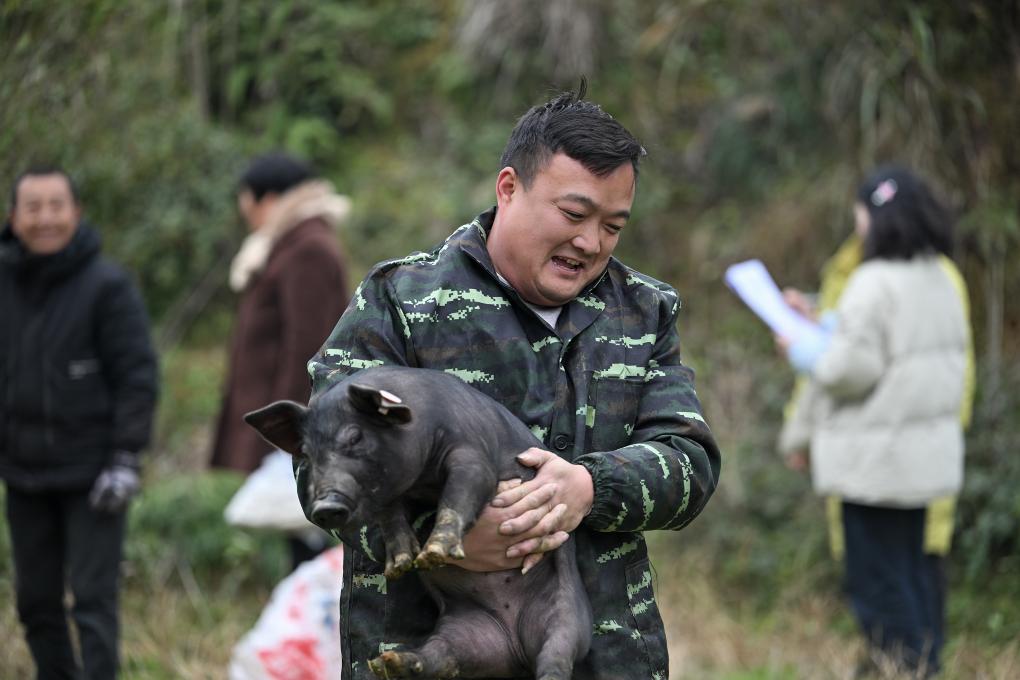 2024年12月19日,村民们在来凤县现代循环农业产业园内领取黑猪猪苗。(唐俊 摄)