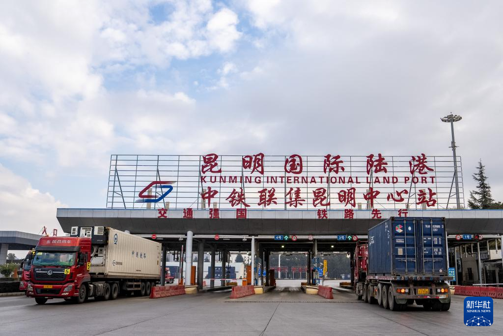 1月2日,汽车在中铁联集昆明中心站运输集装箱。新华社记者 胡超 摄