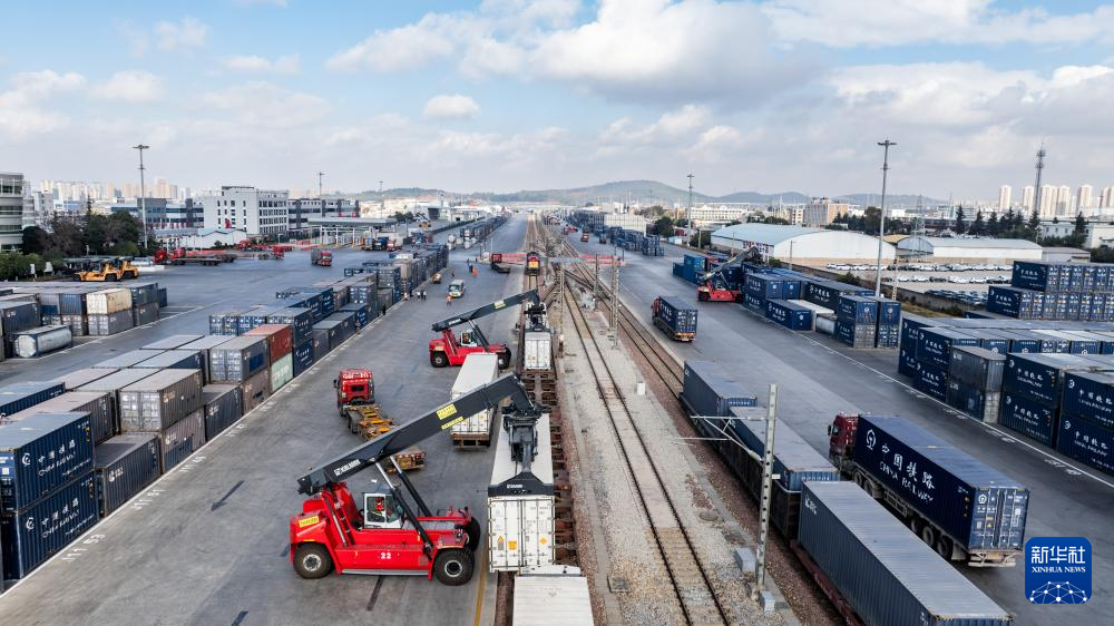 1月2日,中老铁路国际货物列车在云南省昆明市王家营西站进行装箱作业。新华社记者 胡超 摄