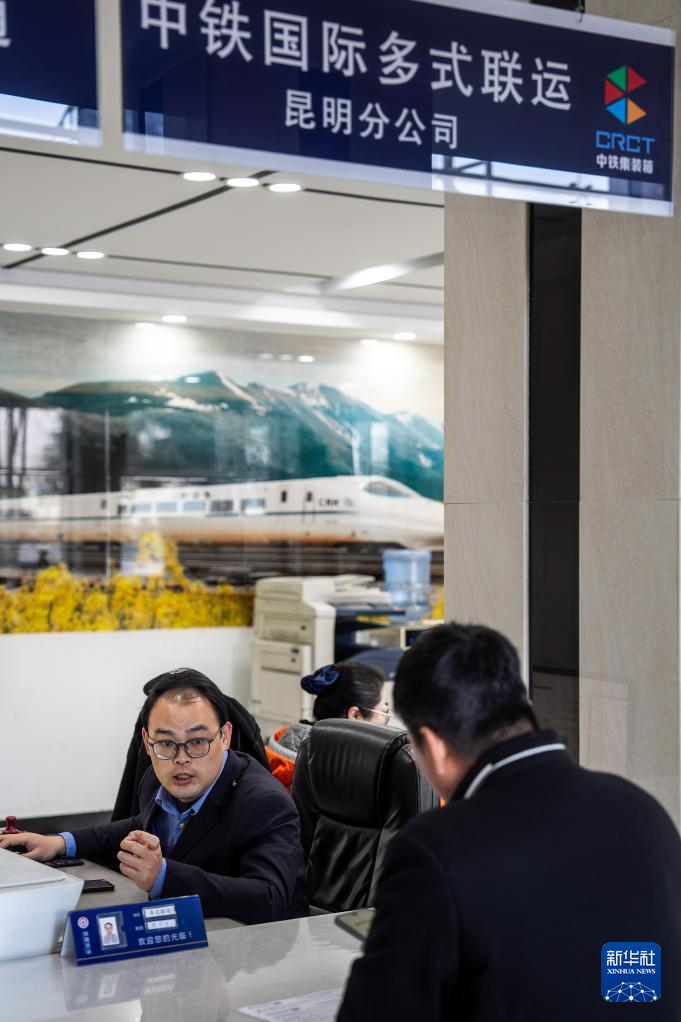 1月2日,在中铁联集昆明中心站业务大厅,工作人员(左)向货主介绍中老铁路货运业务。新华社记者 胡超 摄
