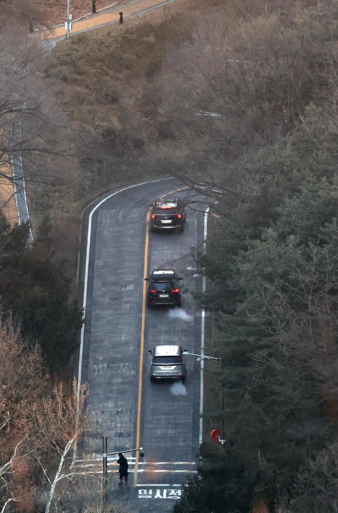 1月3日上午,韩国高级公职人员犯罪调查处工作人员乘坐的车辆驶向首尔龙山区汉南洞的总统官邸。新华社/纽西斯通讯社