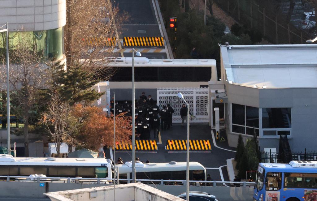 1月3日上午,韩国高级公职人员犯罪调查处工作人员和警方在首尔龙山区汉南洞的总统官邸大门外等待进入。新华社/纽西斯通讯社