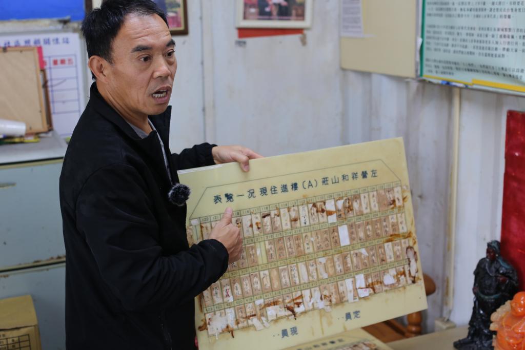 刘德文展示写满老兵姓名的楼栋明细板。新华社记者 陈君 摄