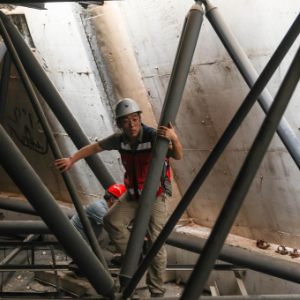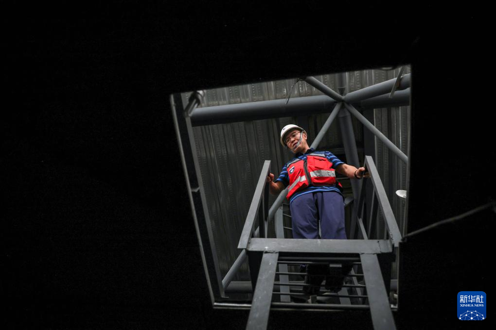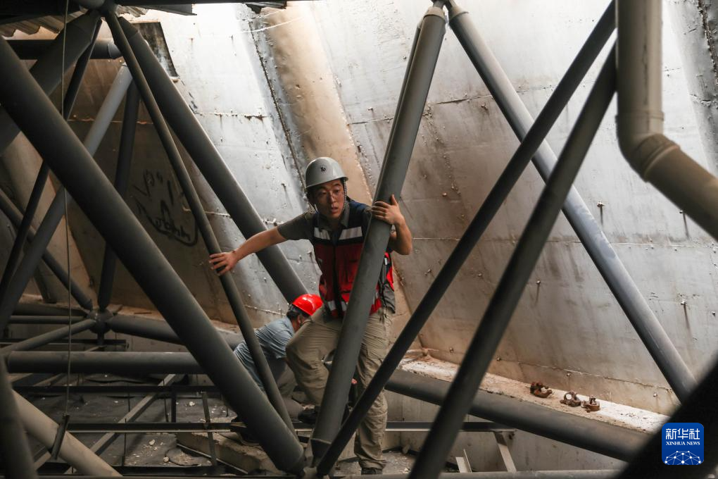 2025年1月1日,在瓦努阿图维拉港,中国地震局工程力学研究所研究员戴君武在一栋建筑的结构顶部网架位置查看受损情况。新华社记者 龙雷 摄