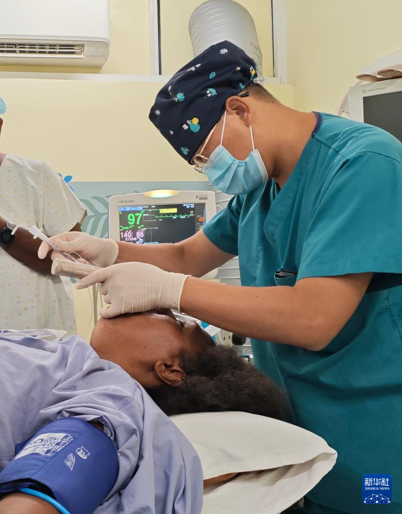 2024年12月19日,在瓦努阿图维拉港,中国援瓦努阿图医疗队麻醉科医生赵艳军在地震后为手术患者实施麻醉。新华社发(中国援瓦努阿图医疗队供图)