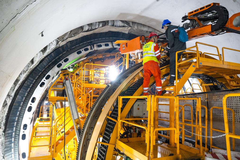 1月5日拍摄的引江补汉工程首台双护盾硬岩掘进机“江汉平安号”掘进施工现场。新华社记者 肖艺九 摄