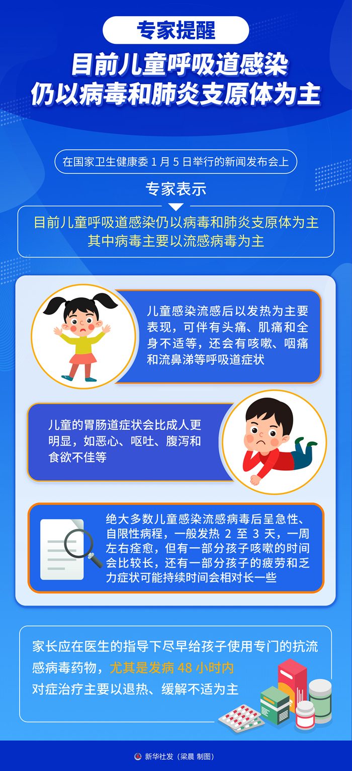 新华社北京1月5日电(记者李恒、董瑞丰)近期呼吸道传染病高发,其中流感病毒阳性检出率上升明显。对此,在国家卫生健康委5日举行的新闻发布会上,专家表示,目前儿童呼吸道感染仍以病毒和肺炎支原体为主,其中病毒主要以流感病毒为主。