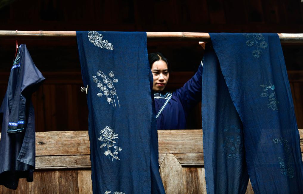 2024年3月18日,贵州省榕江县栽麻镇大利侗寨的村民在晾晒侗布。新华社记者 杨文斌 摄