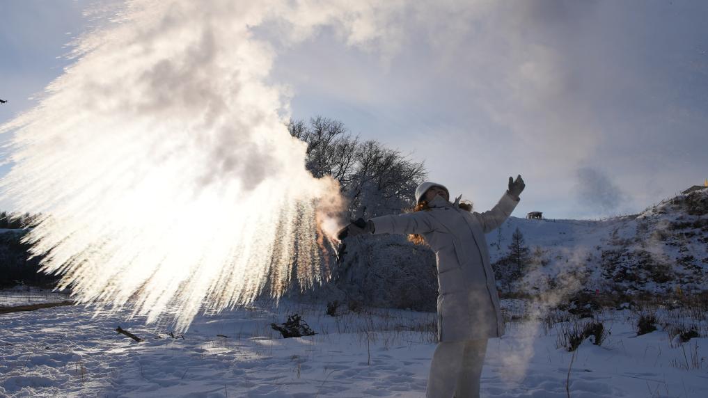 在阿尔山国家森林公园,游客体验“泼水成冰”。新华社记者 恩浩 摄