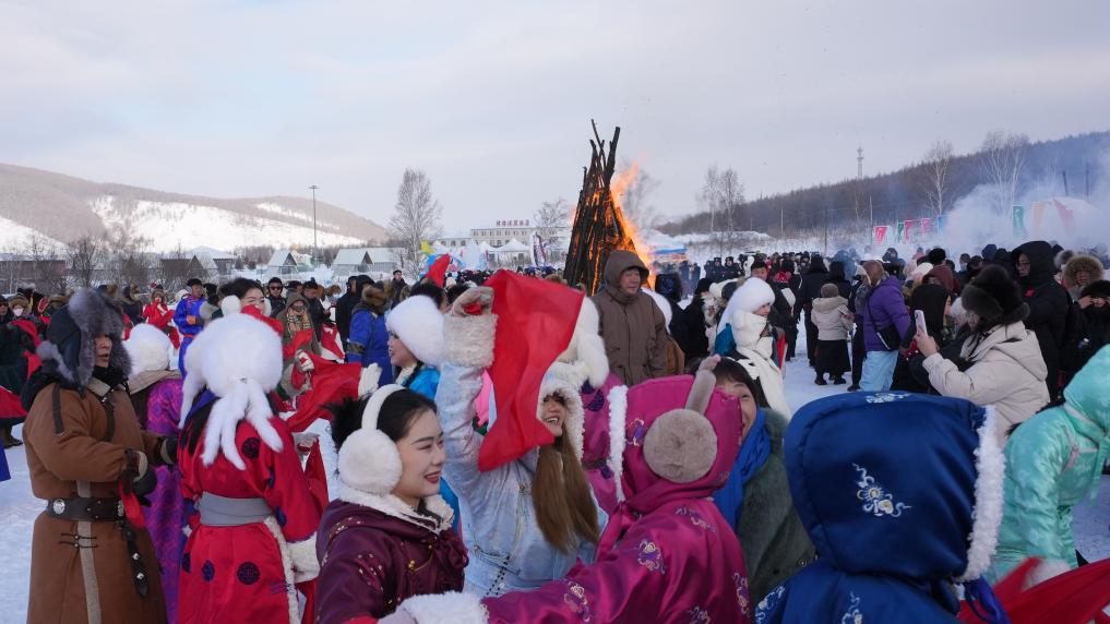 在阿尔山市迎新年冰雪那达慕现场,乌兰牧骑演员邀请游客在篝火前共舞。新华社记者 恩浩 摄