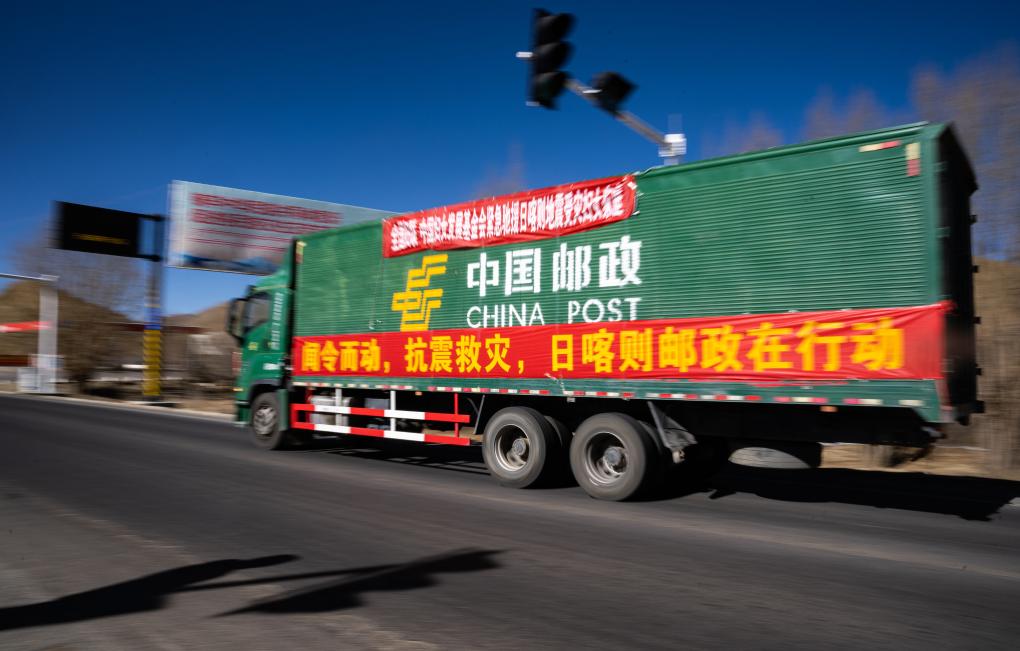 1月8日,在日喀则市境内的318国道,中国邮政的抗震救灾运输车辆向灾区方向驶去。新华社记者 丁增尼达 摄