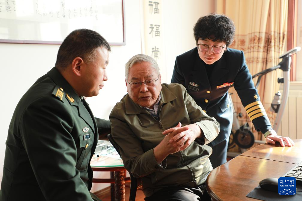 山东省军区青岛第二离职干部休养所退休干部、原海军潜艇学院教授胡均川(中)在与干休所工作人员交流学习心得(1月3日摄)。新华社记者 李秉宣 摄