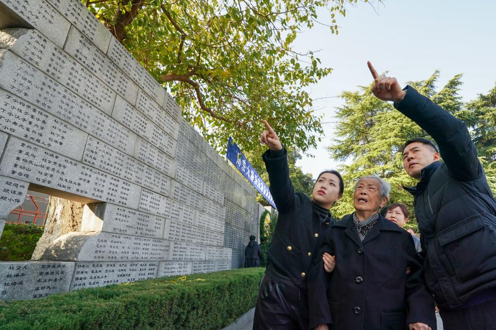 在南京大屠杀死难者家庭祭告活动中,艾义英(右二)和家人在侵华日军南京大屠杀遇难同胞纪念馆的“哭墙”上寻找家人姓名(2024年12月1日摄)。新华社记者 李博 摄