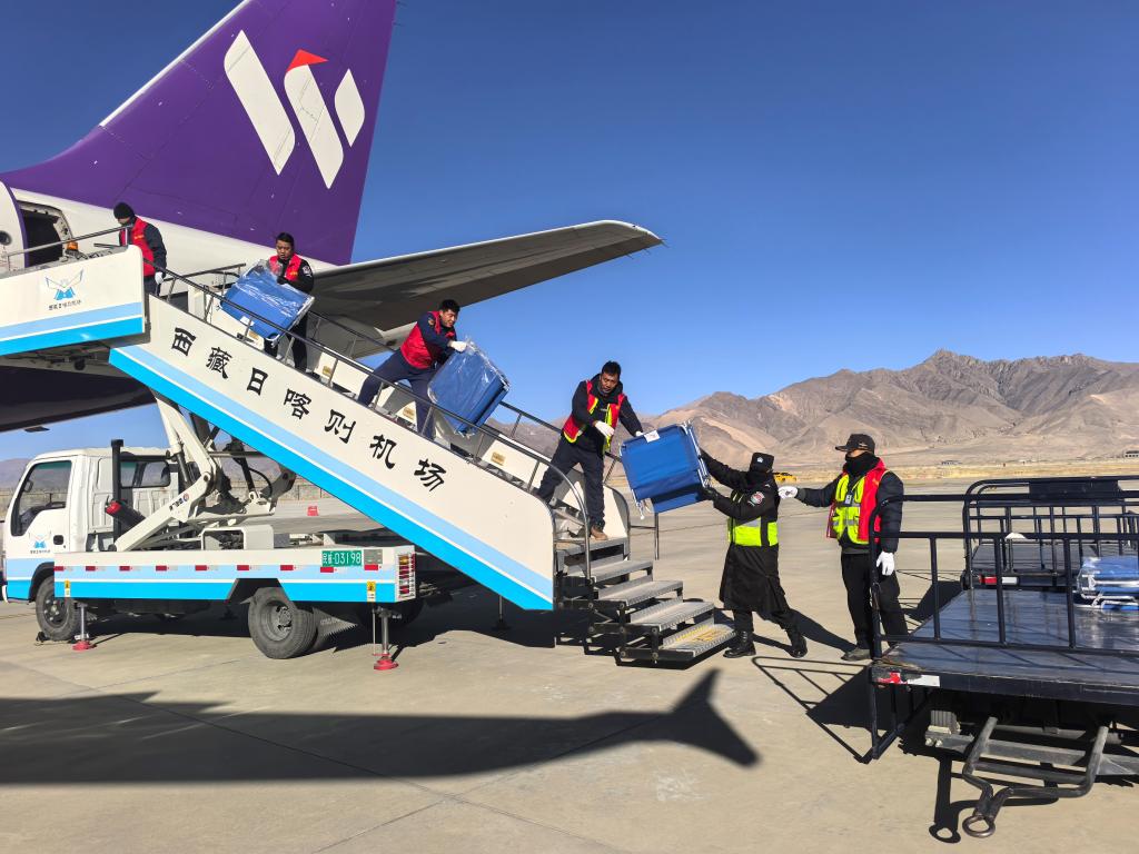1月9日上午,救援物资抵达西藏日喀则机场。新华社发