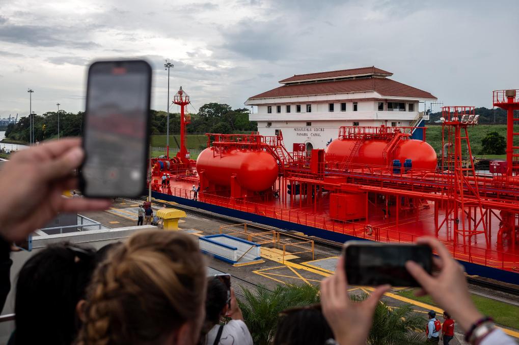 2024年12月31日,在巴拿马首都巴拿马城附近,游客在巴拿马运河的米拉弗洛雷斯船闸游客中心观看轮船通过船闸驶入太平洋。新华社记者李木子摄