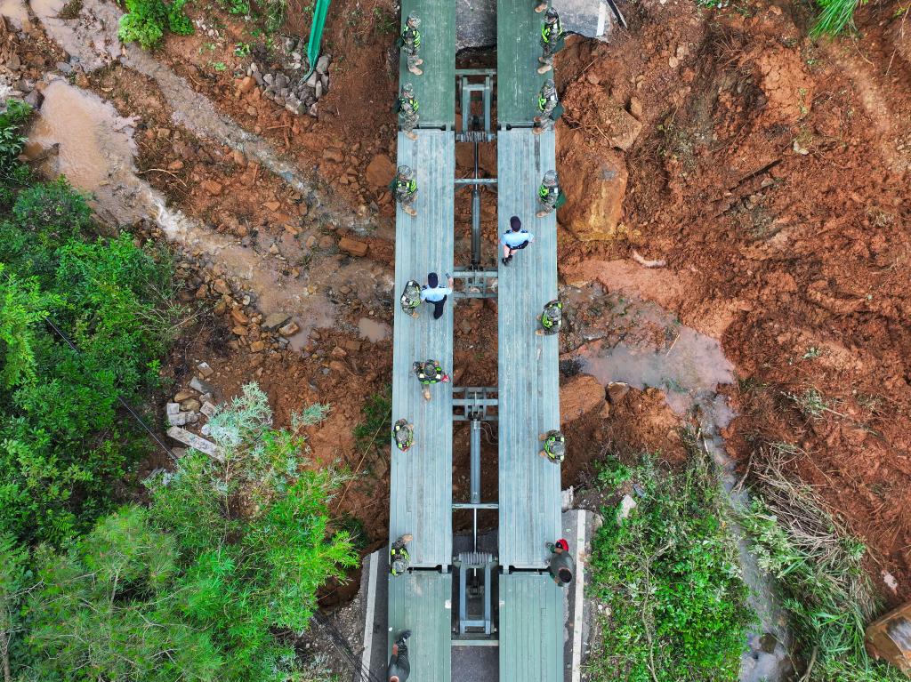 2024年6月22日,在安徽省黄山市歙县绍濂乡小溪村,武警官兵架设的临时桥梁贯通。