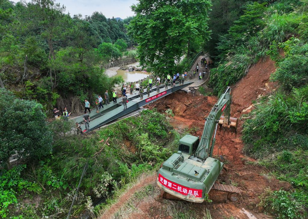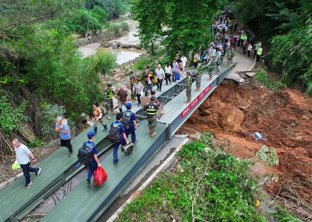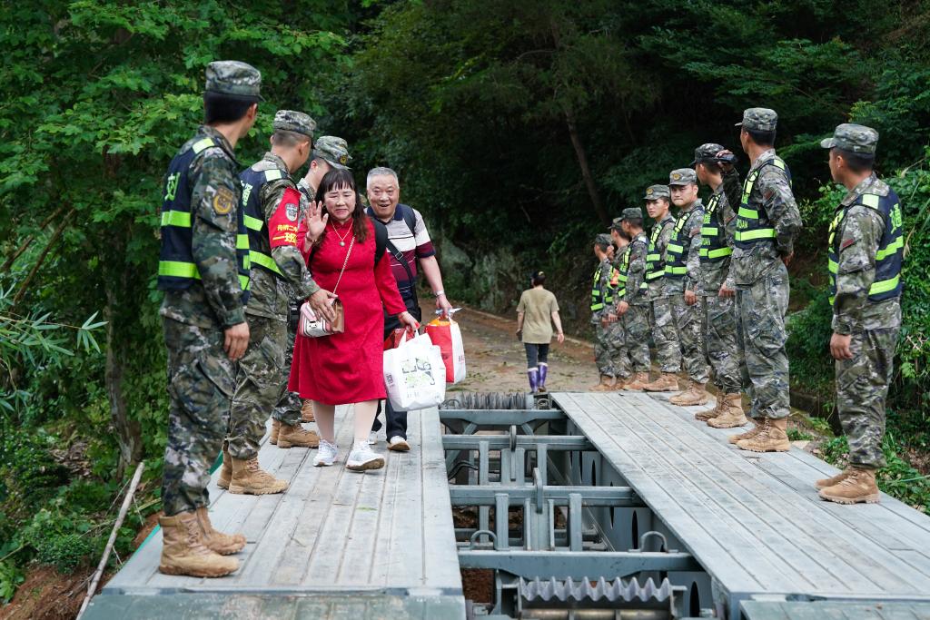 2024年6月22日,在安徽省黄山市歙县绍濂乡小溪村,武警官兵架设的临时桥梁贯通,村民通过桥梁出行。
