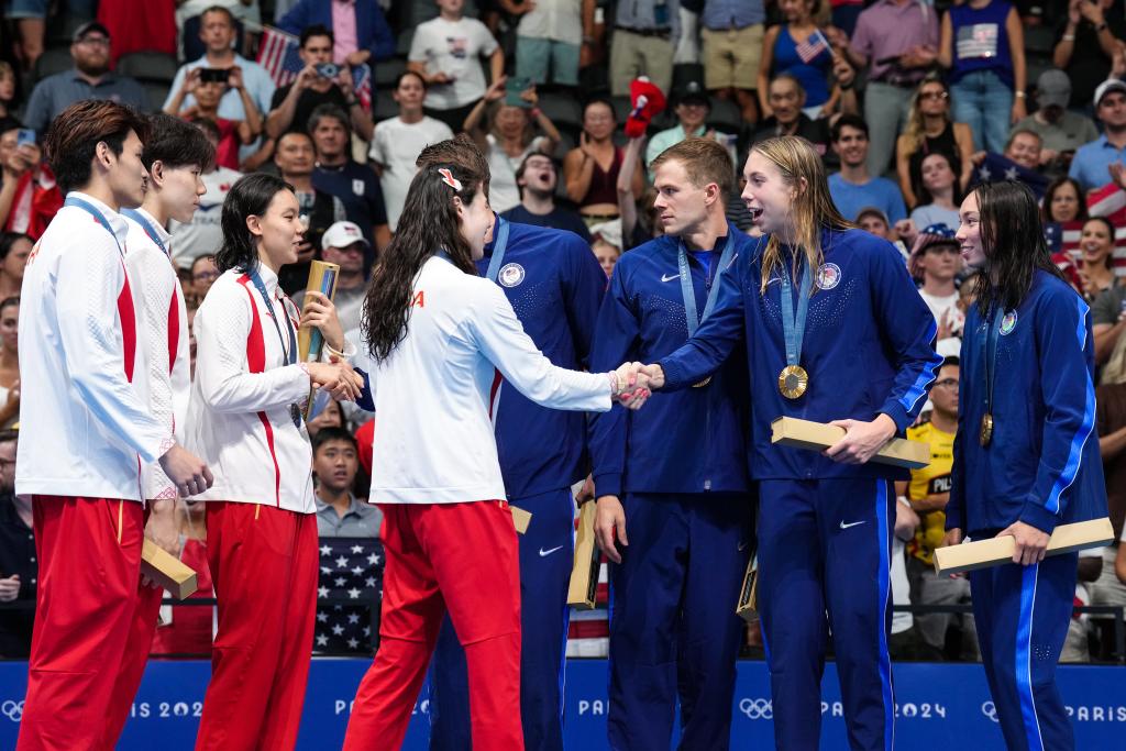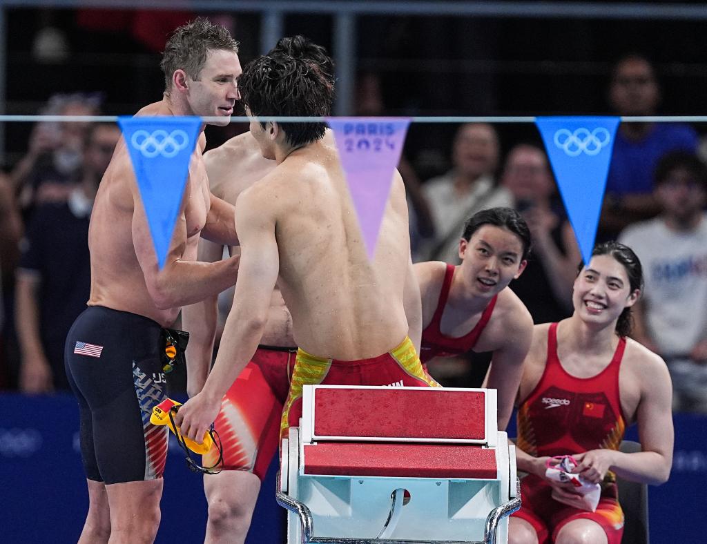 2024年8月3日,中国选手在巴黎奥运会游泳男女4x100米混合泳颁奖仪式上向美国选手表示祝贺。