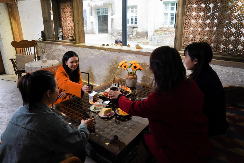 2023年3月9日,年轻人在安徽省黄山市屯溪区的一处茶空间里“围炉煮茶”。