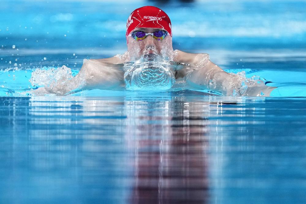 2024年7月27日,中国选手覃海洋在男子100米蛙泳预赛中。