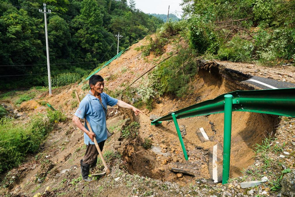 2024年6月21日,在歙县桂林镇008县道一处塌方点,当地村民程海生查看损毁路段。