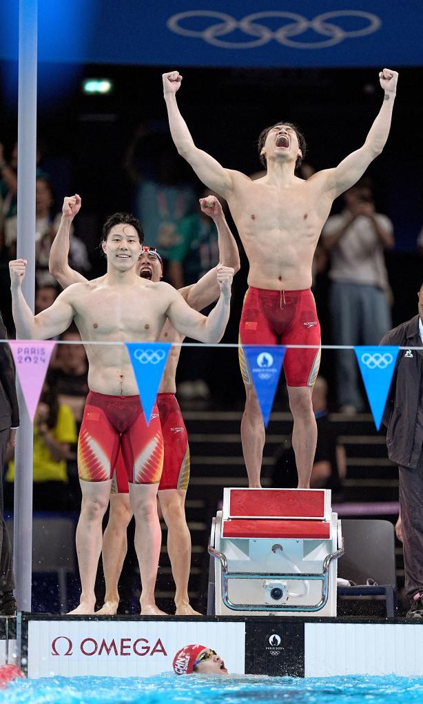 2024年8月4日,中国队选手获得巴黎奥运会游泳男子4x100米混合泳接力冠军后庆祝。