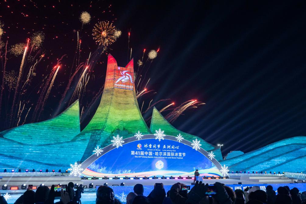 1月5日,在哈尔滨冰雪大世界园区,人们观看第41届中国·哈尔滨国际冰雪节开幕式。新华社记者 谢剑飞 摄