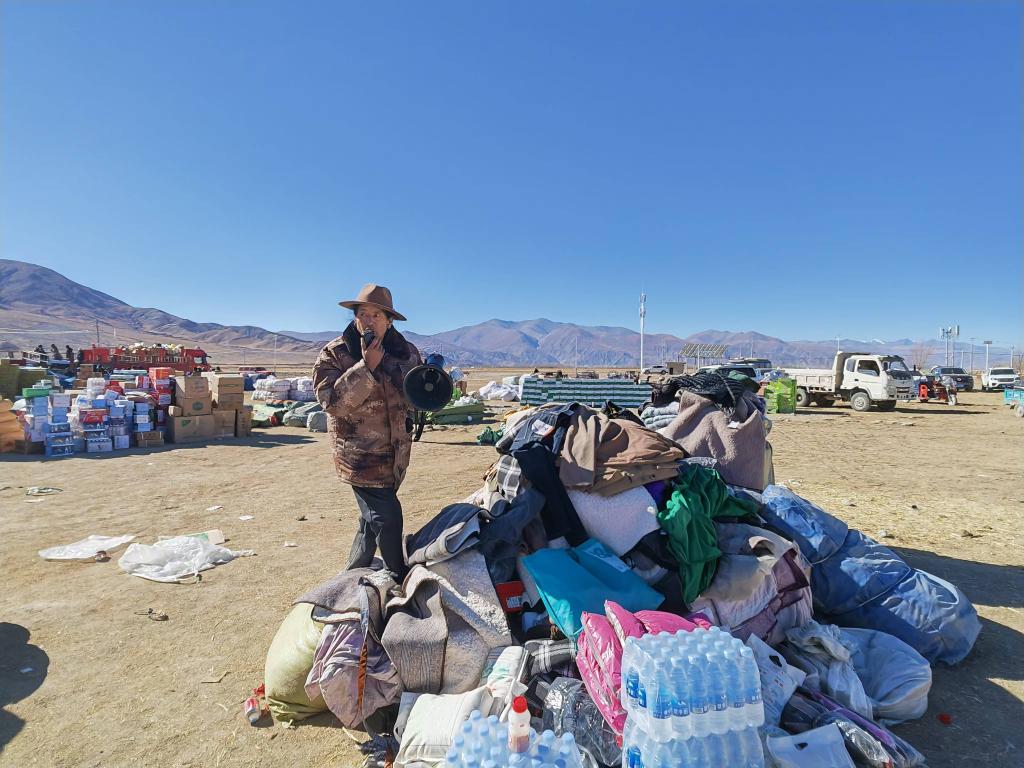 9日上午11时许,在西藏日喀则市拉孜县拉孜镇措布村村委会门口,52岁的村党支部书记达娃正在调度抗震物资。