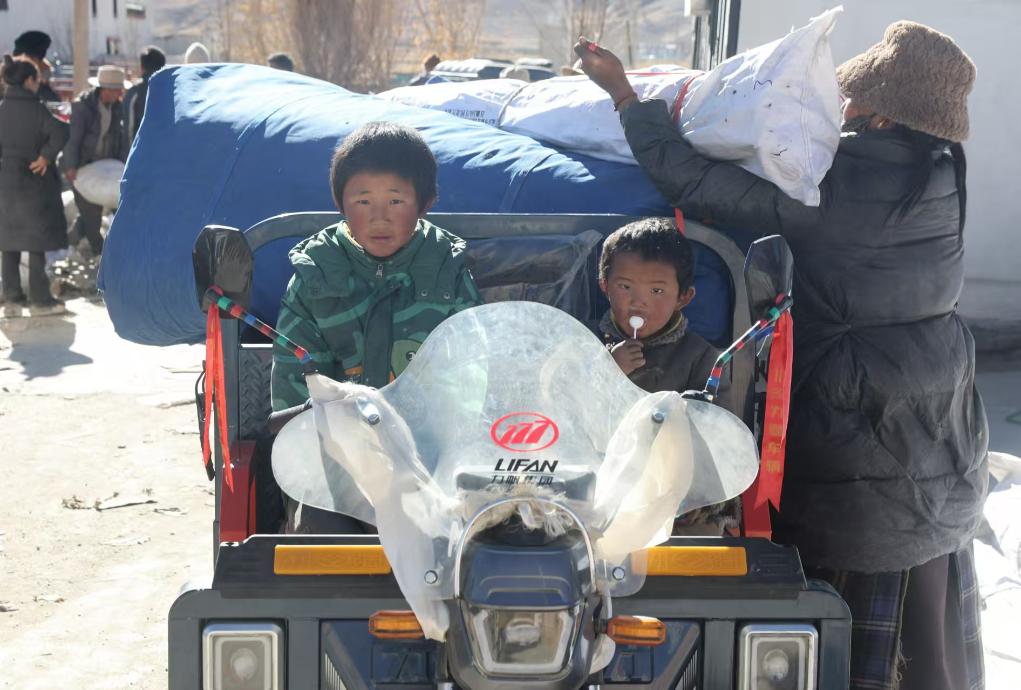 1月9日,受灾群众在措布村村委会领取帐篷等救灾物资。