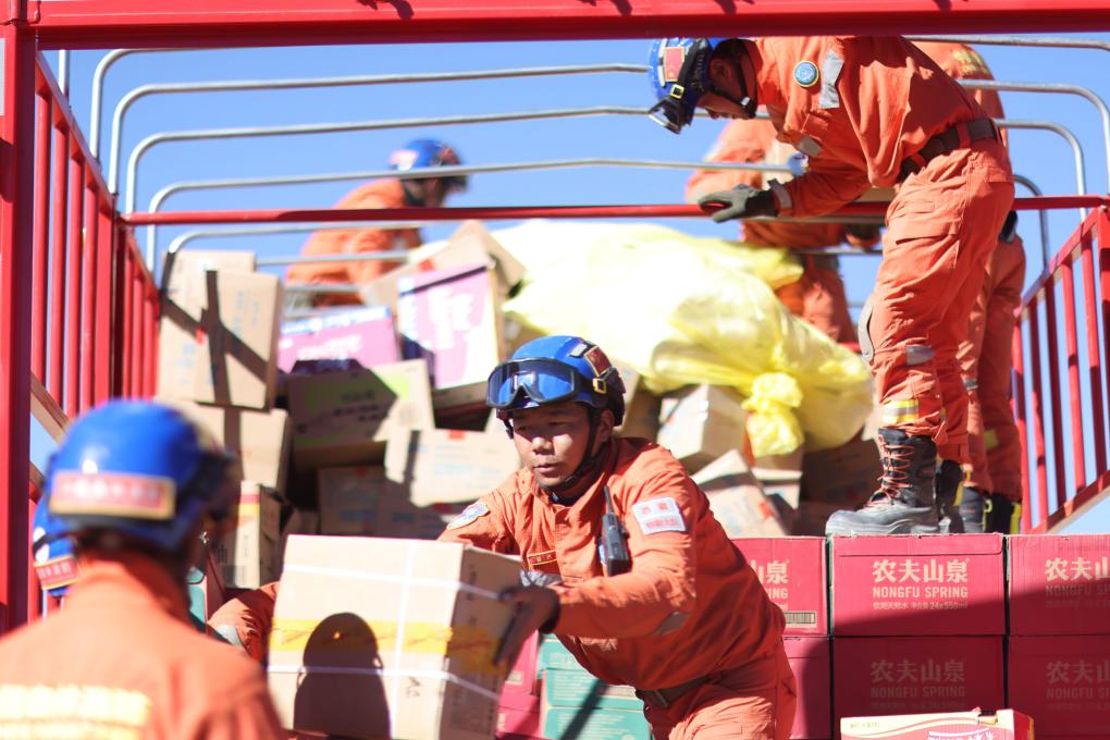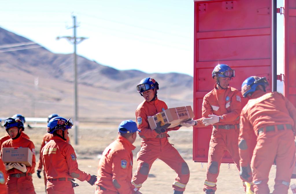 1月9日,救援人员在拉孜县拉孜镇措布村卸载救灾物资。