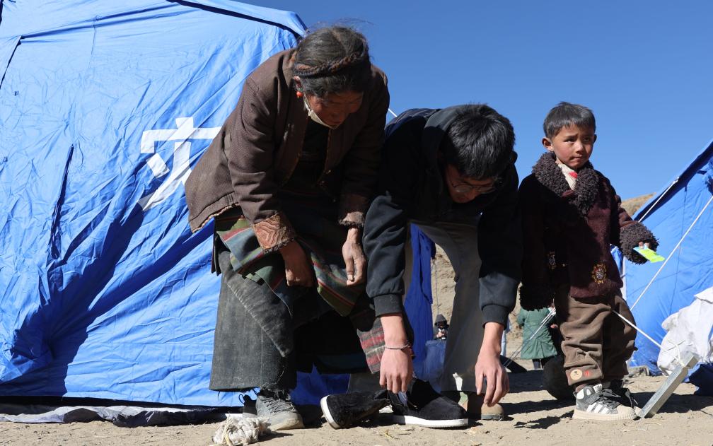 1月8日,在长所乡古荣村安置点,一名大学生志愿者(左二)帮助受灾群众换上保暖的新鞋。