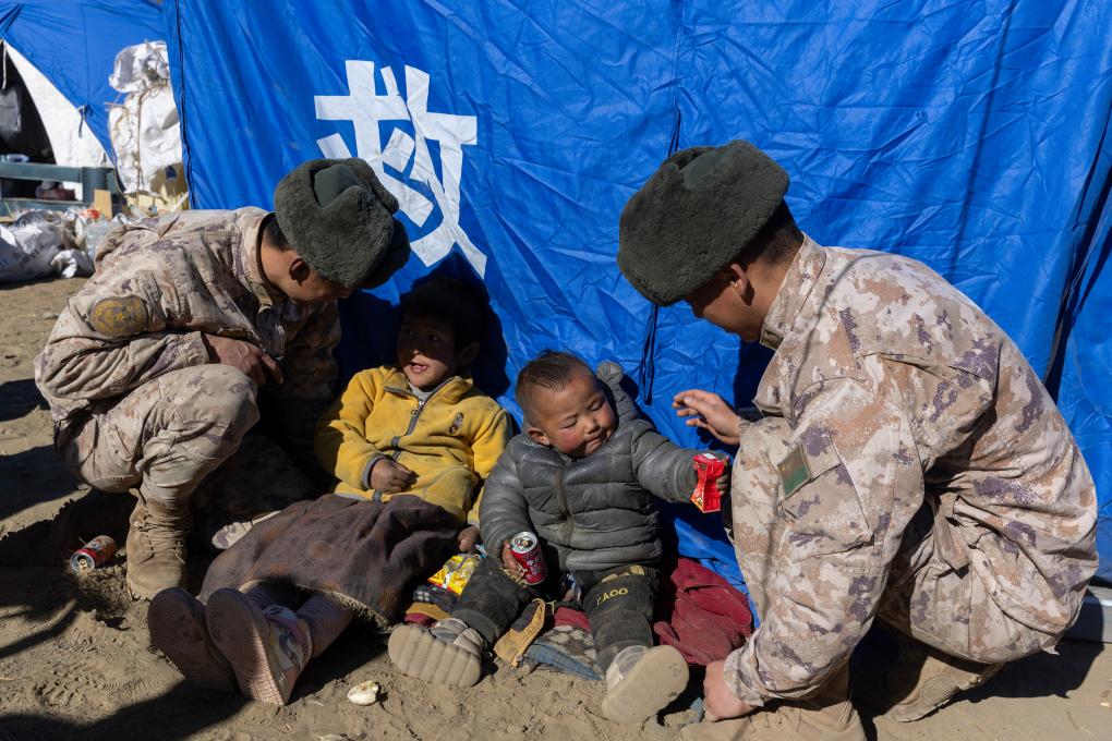 1月8日,参与救灾的解放军战士在长所乡古荣村安置点安慰受灾儿童。