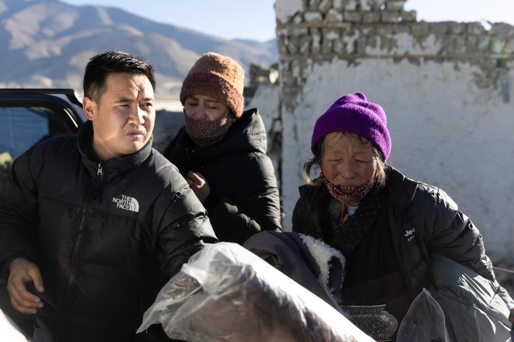 1月8日,占多(左)和玉珍(中)在定日县长所乡通来村给受灾群众发放御寒衣物。