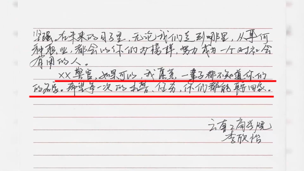 “如果可以,我愿意一辈子都不知道你们的名字。希望每一次出警、任务,你们都能平安回家。”在给戍边民警的一封亲笔信中,云南大学生李欣怡写下了这样一句话。