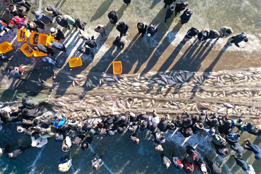 “今年的头网鱼里最大有四五十斤重,花鲢鱼、鲤鱼、草鱼等等种类很丰富,是个好兆头。”鱼把头王永财难掩兴奋地说。出鱼不到六小时,线上线下就售出冬捕鱼7000多条、2万多斤。“头鱼”经过竞拍,以68万元价格成交。