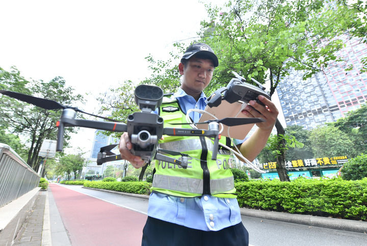 在广西柳州市桂中大道,交警准备用无人机对道路进行巡查(2024年5月24日摄)。新华社记者 黄孝邦 摄