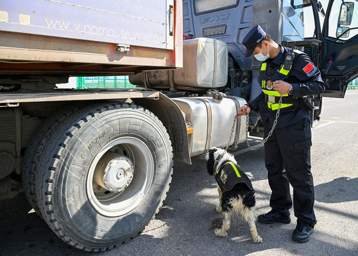 在新疆霍尔果斯公路口岸,边检警察和警犬在查验入境车辆(2024年4月18日摄)。新华社记者 陈朔 摄