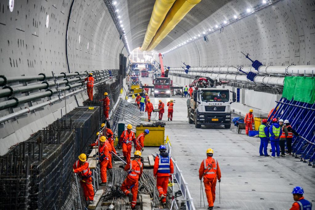 工程建设者在济南黄岗路穿黄隧道内施工,隧道将连通济南主城区与新旧动能转换起步区。新华社记者朱峥 摄