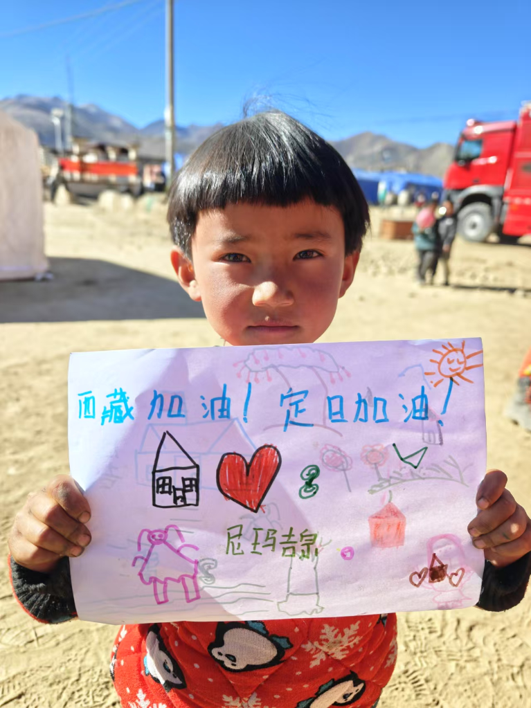 6岁的尼玛吉宗穿着花棉袄,先画了一顶小小的帐篷,在旁边画上了大大的红心,把梳着羊角辫的自己也画上去,天空画上了太阳。她想了想,工工整整地写上:“西藏加油!”“定日加油!”
