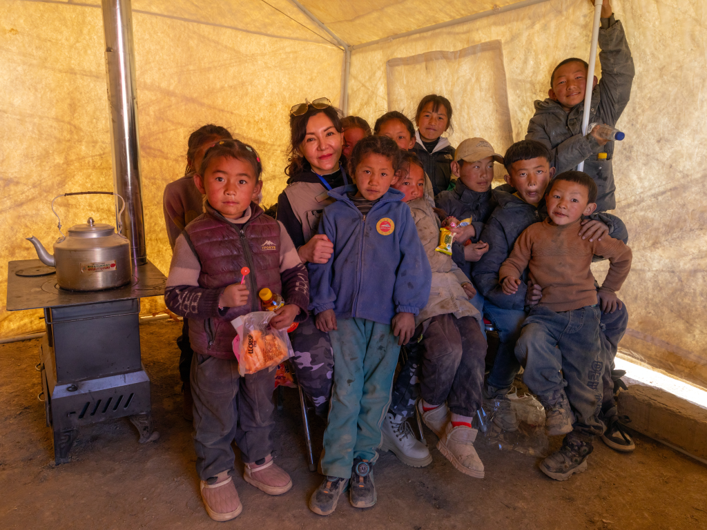 12日上午,西藏定日县曲洛乡措昂村的集中安置点里,一群小姑娘围着一名大姐姐,欢呼雀跃。她们从大姐姐的手里接过颜料笔、画纸、糖果等礼物,咧嘴笑了起来。