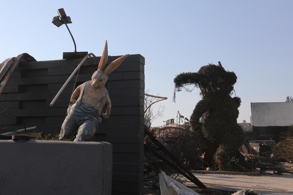 这是1月10日在美国加利福尼亚州洛杉矶县阿尔塔迪纳地区拍摄的被山火摧毁的当地知名博物馆——“兔子博物馆”。新华社发(邱晨摄)