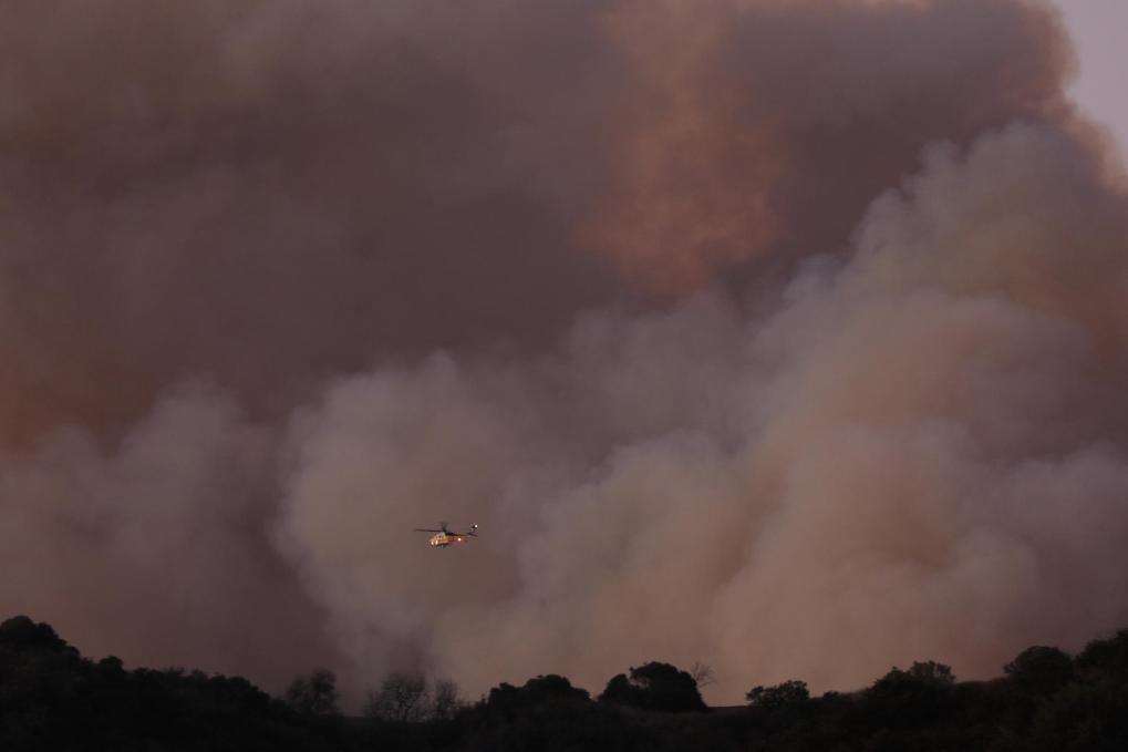 1月11日,一架消防直升机在美国加利福尼亚州洛杉矶曼德维尔峡谷的山丘上空飞行。新华社发(邱晨摄)