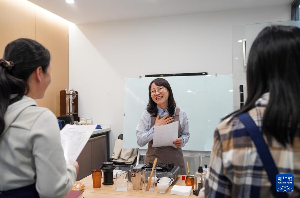 含旨餐饮管理有限公司总经理黄春善在进行咖啡制作培训教学(2023年4月4日摄)。新华社记者 颜麟蕴 摄