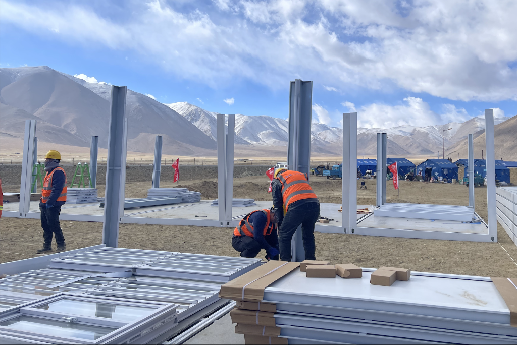 1月13日上午,中铁二十局工作人员在定日县措果乡雪珠村安置点搭建活动板房。新华社记者蒋梦辰 摄