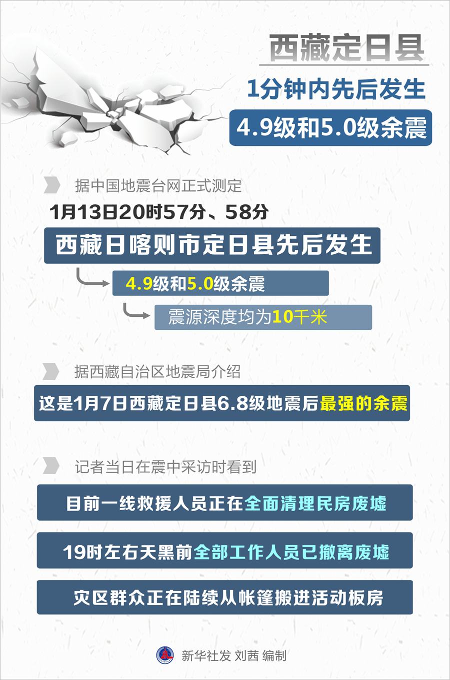 新华社拉萨1月13日电(记者格桑边觉、邱星翔)据中国地震台网正式测定,1月13日20时57分、58分,西藏日喀则市定日县先后发生4.9级和5.0级余震,震源深度均为10千米。