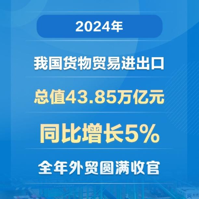 2024年我国货物贸易进出口总值43.85万亿元,同比增长5%