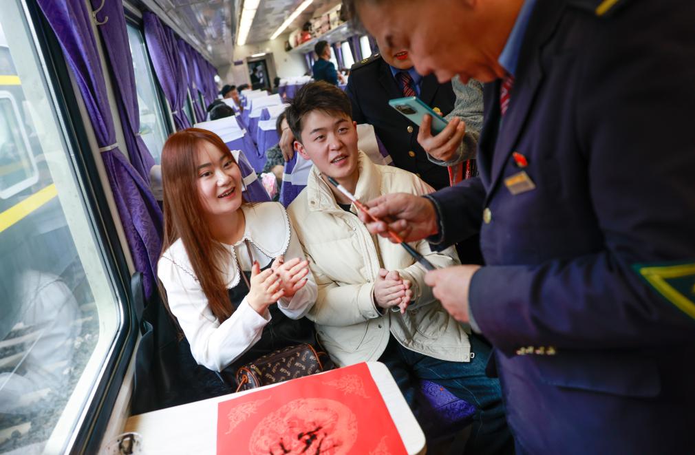 为了让人们“满载而归”,列车员热情组织旅客写“福”字,还送上饱含心意的春联、列车纪念徽章等礼物。