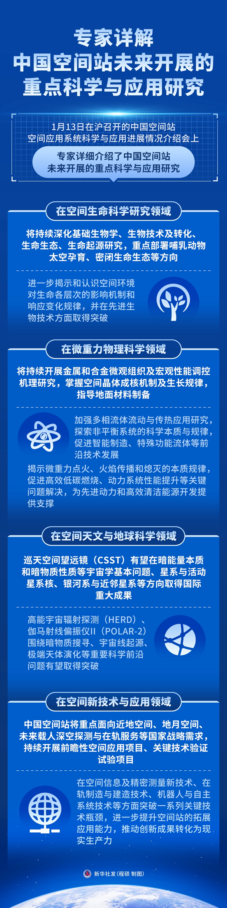 新华社上海1月13日电(记者张建松 喻菲)作为国家太空实验室,中国空间站将在今后10年至15年的运营中开展千余项研究。13日在沪召开的中国空间站空间应用系统科学与应用进展情况介绍会上,专家详细介绍了中国空间站未来开展的重点科学与应用研究。
