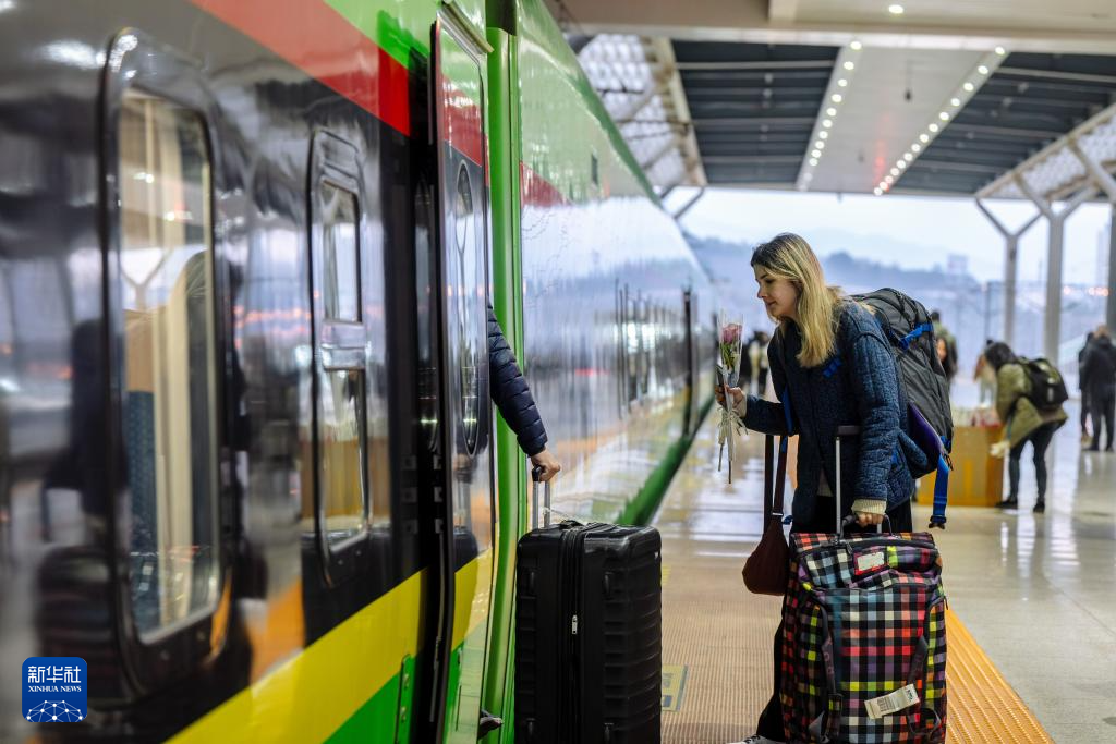 1月14日,一名外国旅客在昆明南站乘坐D87次中老铁路国际旅客列车。新华社记者 胡超 摄